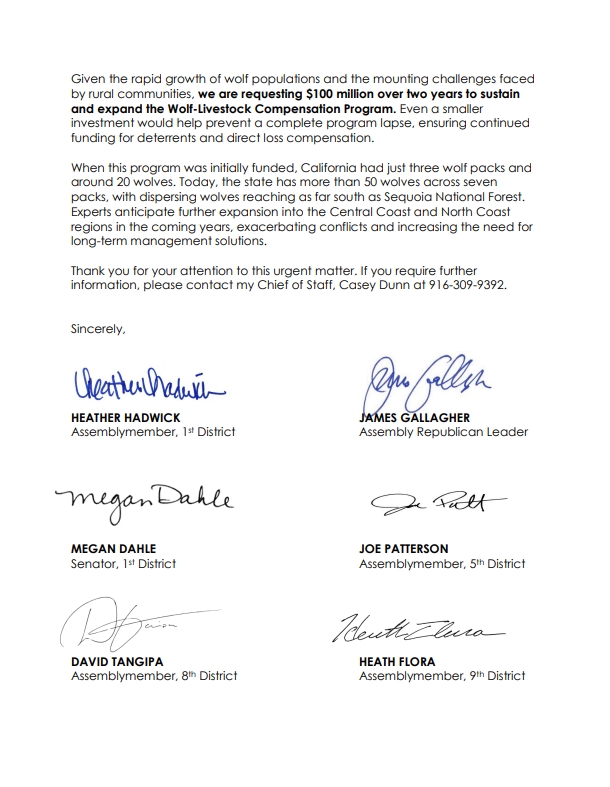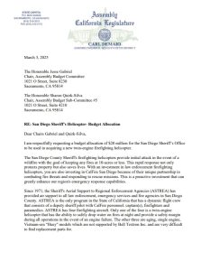Re: Funding for CDFW Wolf-Livestock Compensation ProgramFebruary 24, 2025Letters Previous Post AB-1346: Military Dependents Resident Tuition Next Post Re: San Diego Sheriff’s Helicopter- Budget Allocation