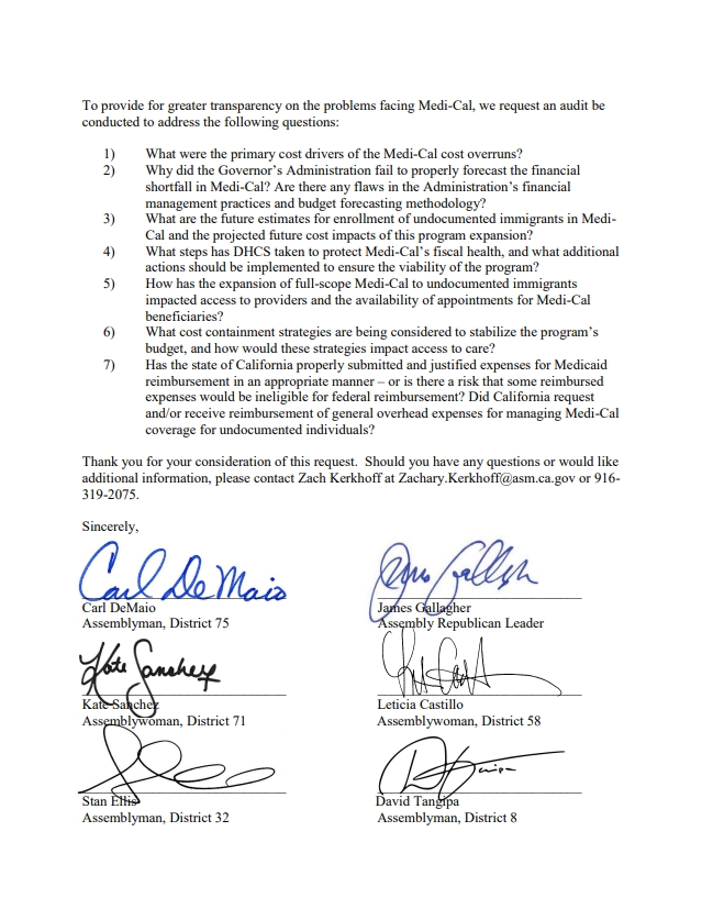Re: Request for Audit on Medi-Cal Cost IncreasesApril 7, 2025Letters Previous Post California's Soft-On-Crime Policies Must End | Opinion Next Post DeMaio and Desmond to Unveil “Safe and Secure Battery Storage Act” Amid Surge of Toxic Battery Fires in California