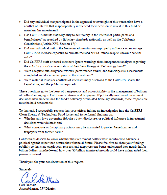 Re: Requesting Federal Investigation into Potential Wrongdoing and Fiduciary Negligence in CalPERS “Green Energy & Technology Fund” Investment LossNovember 6, 2025Letters Previous Post Re: Opposition to the Proposed Residential Rental Price Gouging, Fee Exploitation, and Cost Transparency Ordinance Next Post DeMaio Calls for Federal Investigation of CalPERS’ $3 Billion in Losses on Green New Deal Scam Investments